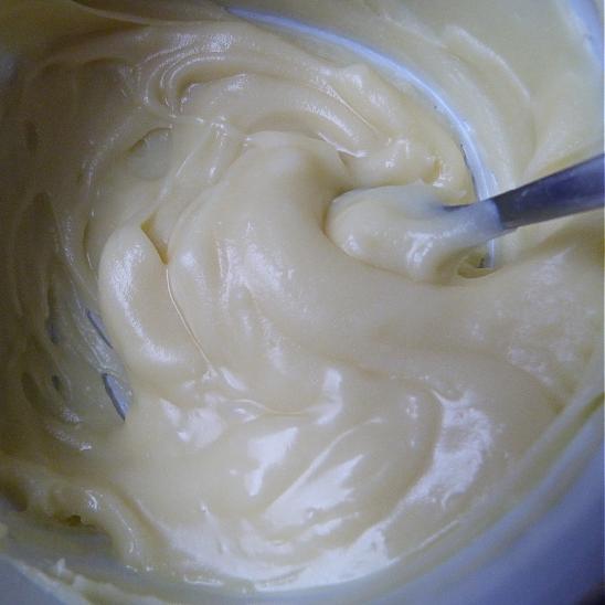 3. Rozpustenú hmotu vyberte z horúcej vody. Nechajte ju mierne vychladnúť nech nie je úplne horúca a pridajte do nej vitamín E (slúži ako antioxidant). Následne prilejte aj mandľový olej a ak chcete aby maslo malo našľahanejšiu textúru môžete pridať aj kozmetický glycerín.